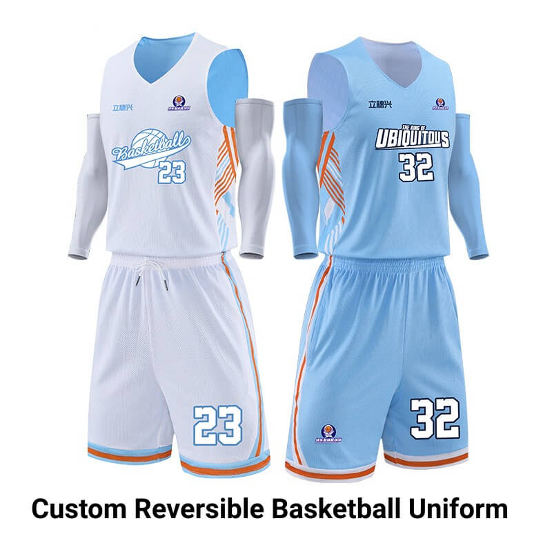 These custom blue white reversible basketball jerseys & shorts are perfect for youth and adult teams. The Jerseys and shorts have a custom logo and are available in bulk orders ensuring a professional uniform for any team. Featuring a comfortable fit and vibrant colors these jerseys will take your team to the next level.